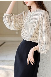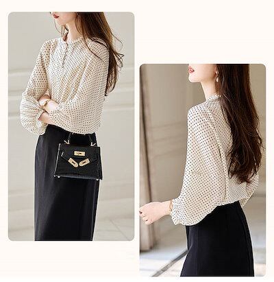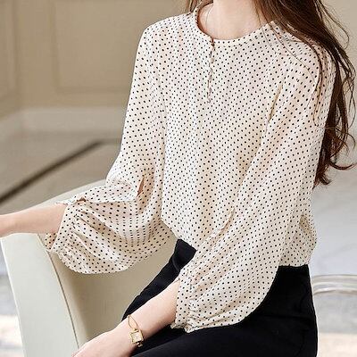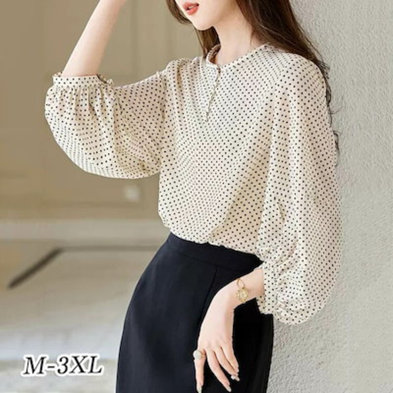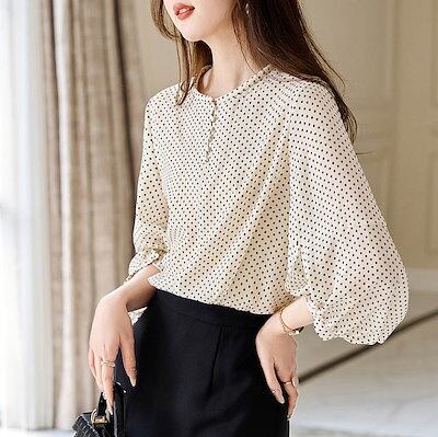 ブラウス レディース 春 夏 長袖 トップス ゆったり ドット柄 シャツブラウス ぽわん袖 ボリュームスリーブ オフィス シフォンブラウス きれいめ おしゃれ