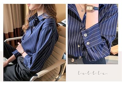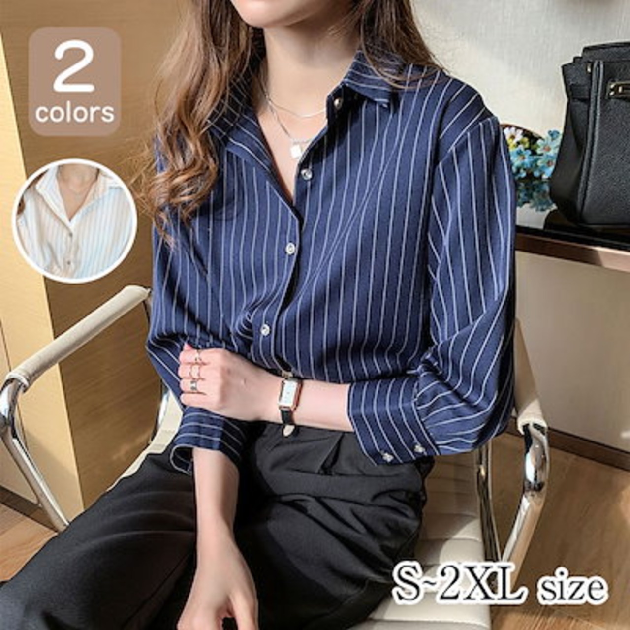 ブラウス レディース 春 夏 秋 長袖 前開き Vネック オフィス きれいめ ストライプ柄 シャツ 20代 30代 40代 50代 大人可愛い 着やせ おしゃれ 通勤OL 体型カバー オーバーサイズ | DOKO-ME