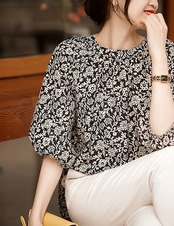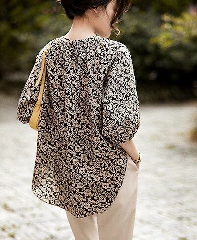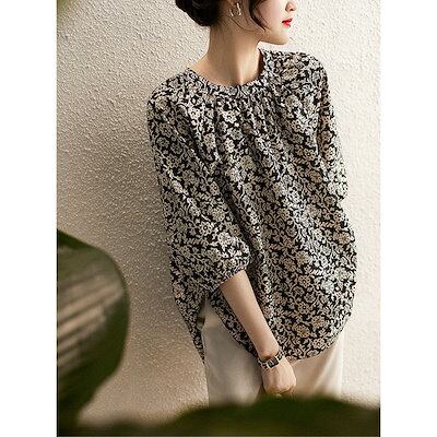 ブラウス レディース 春夏 シフォン 総柄 クルーネック 長袖 韓国風 白シャツ フォーマル トップス 大人 通勤 きれいめ カジュアル おしゃれ 30代 40代 50代