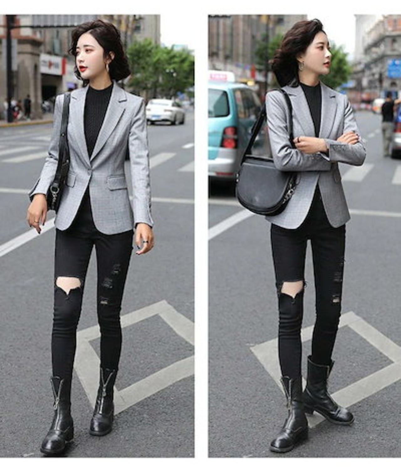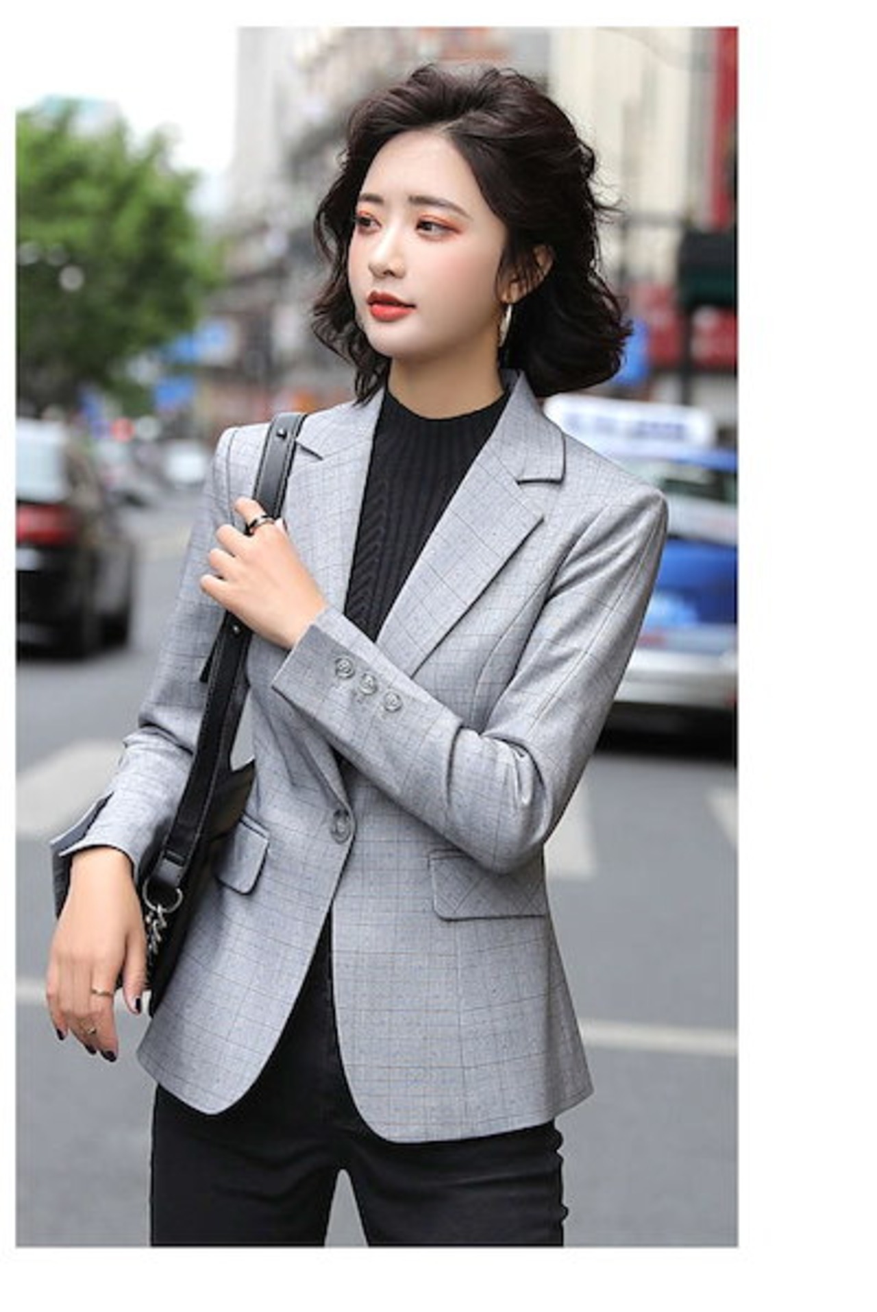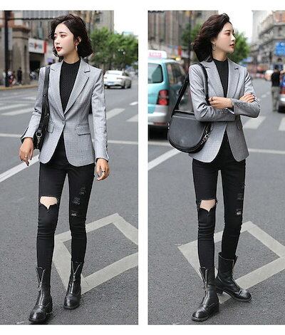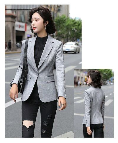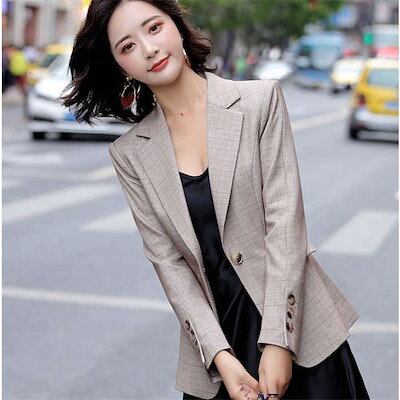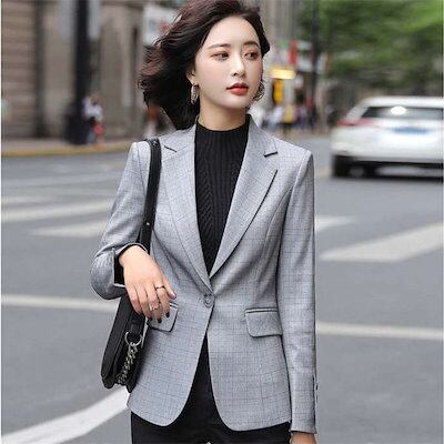 スーツ ジャケット レディース テーラードジャケット 春夏 テーラード チェック柄 フォーマル ミドル丈 アウター トップス 春 秋 冬 コート 長袖 スーツジャケット 可愛い ショート丈 羽織り 通 | DOKO-ME