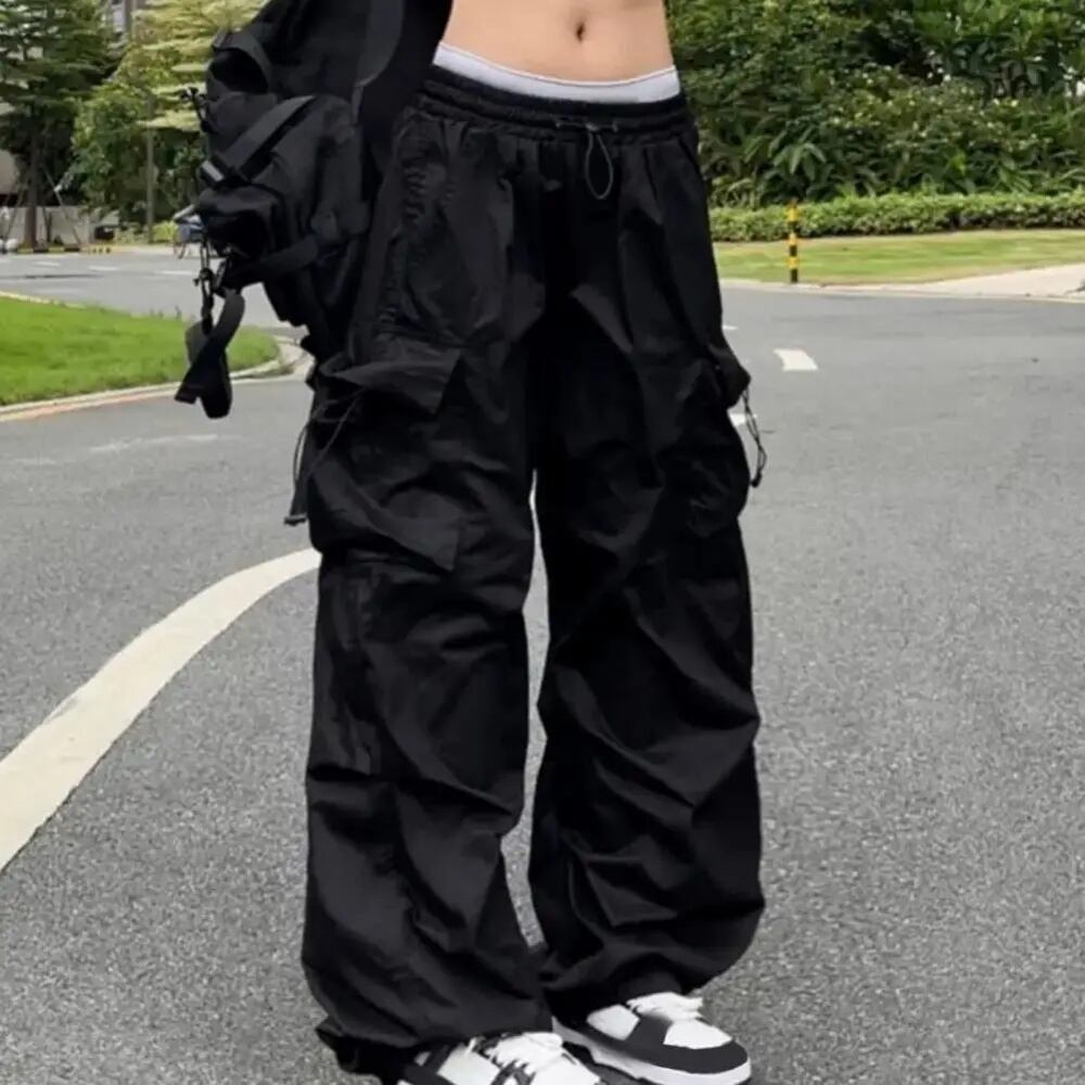 女性用ブラックパラシュートパンツ,カーゴパンツ,特大ポケット,ワイドレッグ,バギー,ストリートウェア,原宿 ボトム ワイドレッグ バギーパンツ T240831223320_02