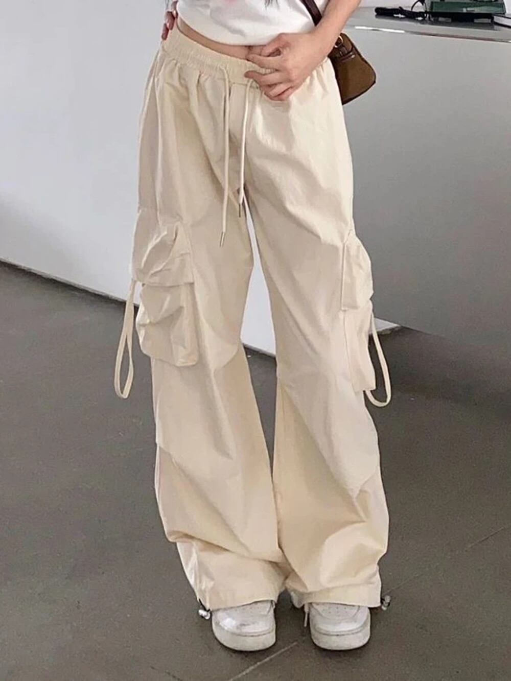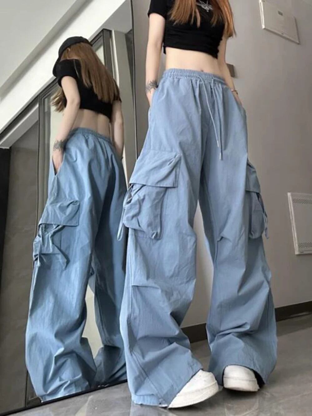 Zoki-女性用ハイウエストカーゴパンツ,ストリートウェア,原宿,ラージ,ポケット,カジュアル,韓国,ルーズフィット ボトム ワイドレッグ バギーパンツ T240831223734_01 | DOKO-ME