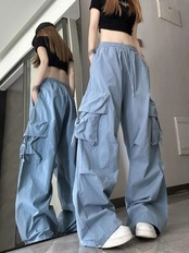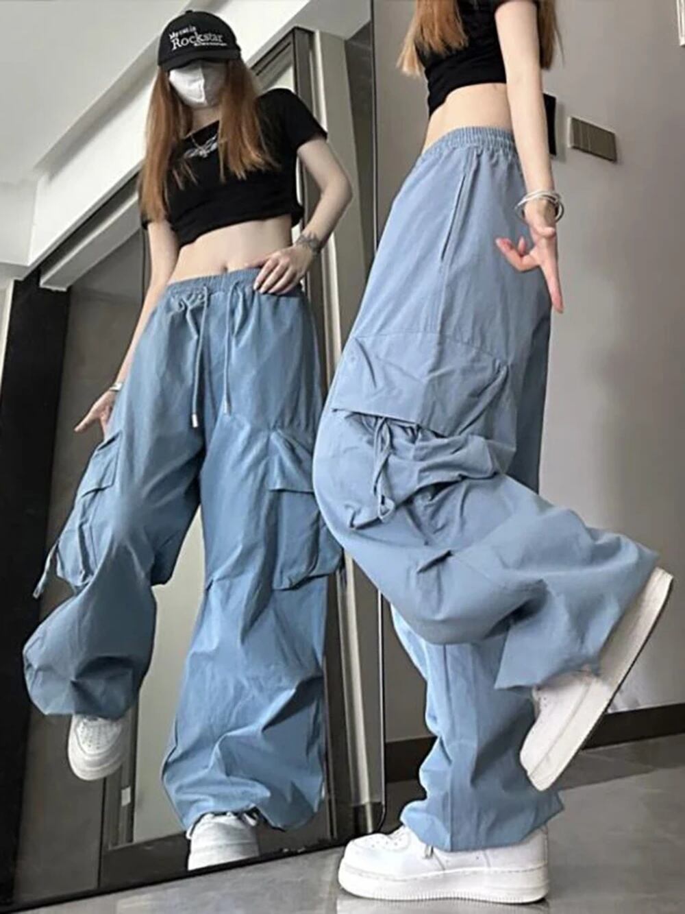 Zoki-女性用ハイウエストカーゴパンツ,ストリートウェア,原宿,ラージ,ポケット,カジュアル,韓国,ルーズフィット ボトム ワイドレッグ バギーパンツ T240831223734_02 | DOKO-ME