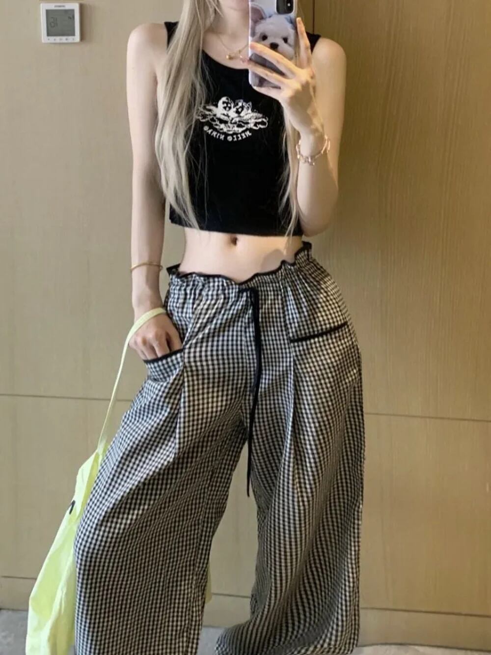 広州-レディースチェック柄バギーパンツ,特大パンツ,韓国ファッション,原宿,和風,カジュアルチェック,ストリートウェア,y2k ボトム ワイドレッグ バギーパンツ T240831223853_01 | DOKO-ME