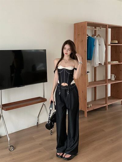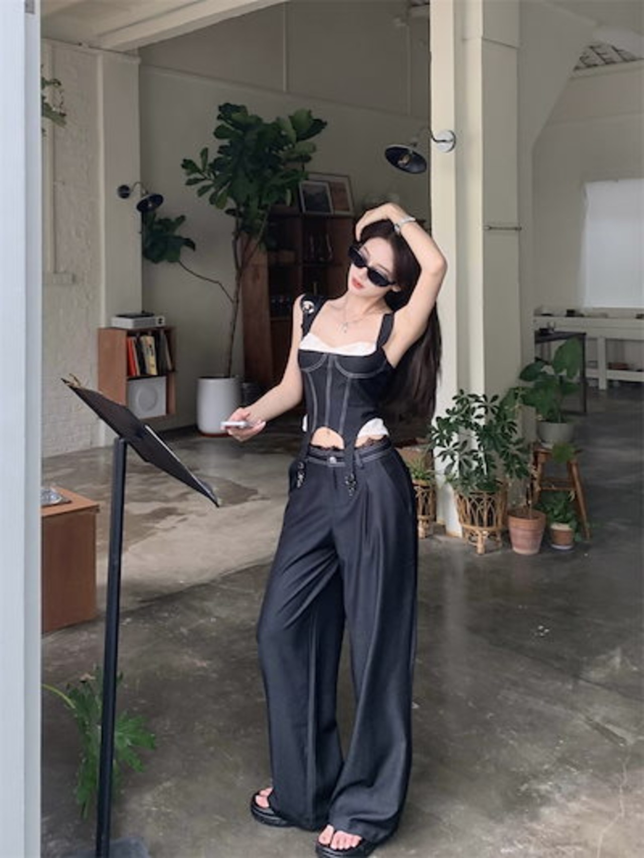 2024 夏ショート丈 キャミソールブラウス ロング丈 パンツ 2点セットスクエアネック 韓国半袖 レッグボトムス トップス 大人可愛いファッションレディースフェミニンカジュアル上下ハイウエスト | DOKO-ME