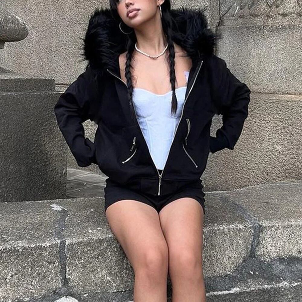 ゴスダークフェイクファーカラーフード付きカーディガン、ジップアップフーディー、ゴシックグランジポケット、秋ブラック、女性y2kストリートウェア、y2k パーカー ジャージ y2k T240908165444_01 | DOKO-ME
