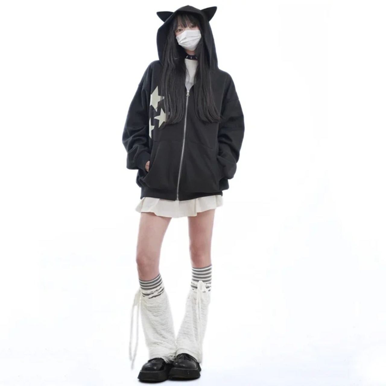 女性のカワイイキャットイヤーフード付きスウェットシャツ、ぬいぐるみエンジェルウィングジップアップフーディー、ハロウィーンパーティー服、若い女の子、y2k、秋 パーカー ジャージ y2k T240908165905_01 | DOKO-ME
