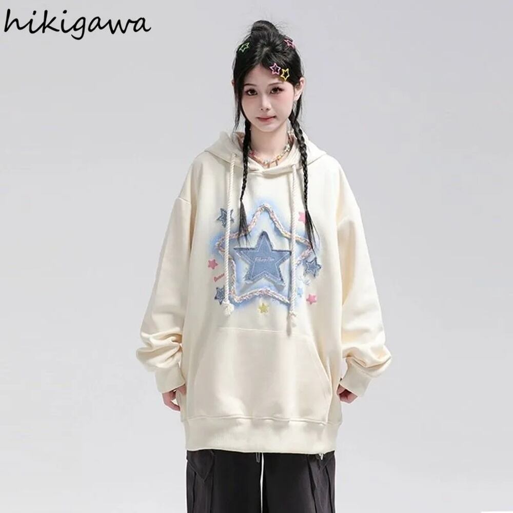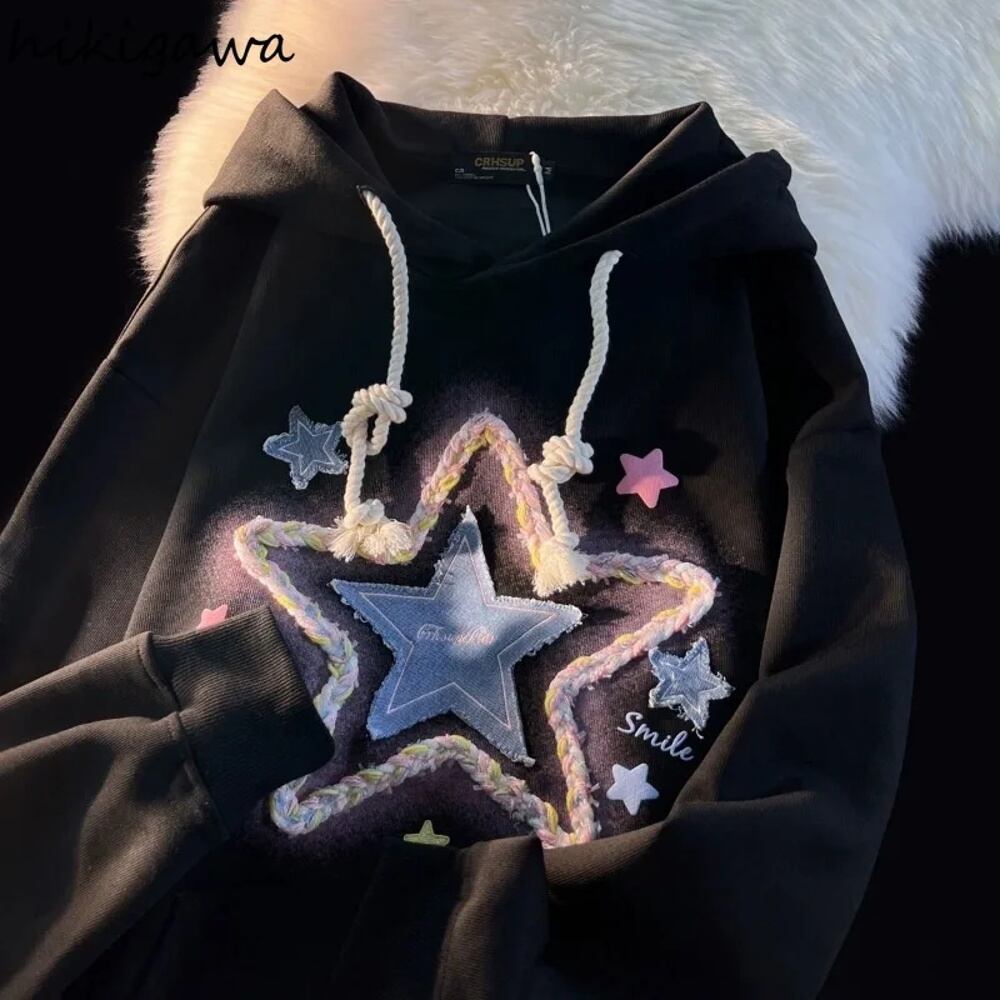 レディーススター刺embroideryオーバーサイズフーディー、原宿フード付きスウェットシャツ、カジュアルストリートウェア、10代の衣装、和風ファッション、y2k パーカー ジャージ y2k T240908170034_02 | DOKO-ME