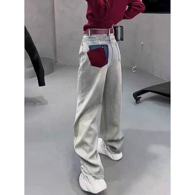 デニムパンツ 春秋の新作 ルーズ 薄手 ストレート ワイドパンツ パーソナリティ 色の衝突 ポケット ジーンズ レディース 韓国