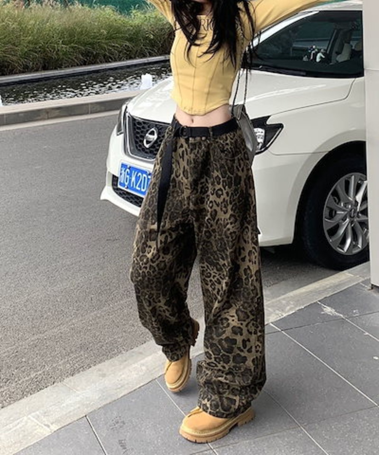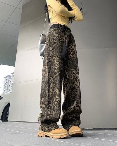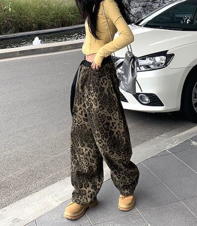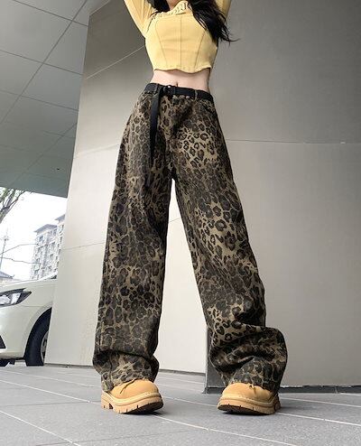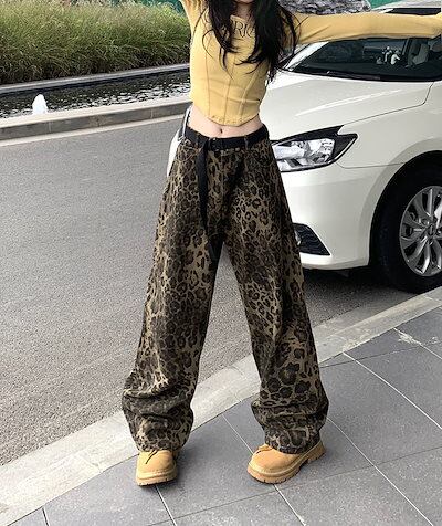 【3日以内出荷】デニムパンツ レトロ ヒョウ柄 デニムパンツ 男女 秋 ドレープ ストレートパンツ ルーズ スリム ワイドパンツ 韓国