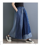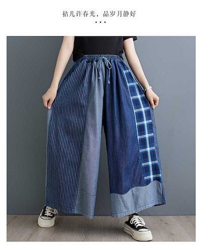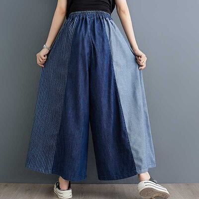 「ファットガール」 2024夏新品 レトロ デニム ドッキング ワイドパンツ フレア 大きいサイズ 巾着 ゴム 体型カバー レディース キュロットスカート ロングパンツ メガ割
