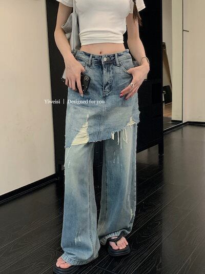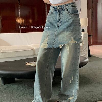 2024 夏 韓国パンツ ロング丈 デニム ジーンズ 2枚重ね ハイウエスト 美脚効果 脚長効果 細見え 夏 おしゃれ かわいい 韓国系ファッション レディース 加工メンズライク