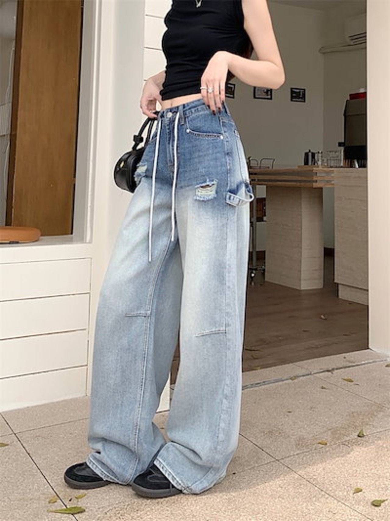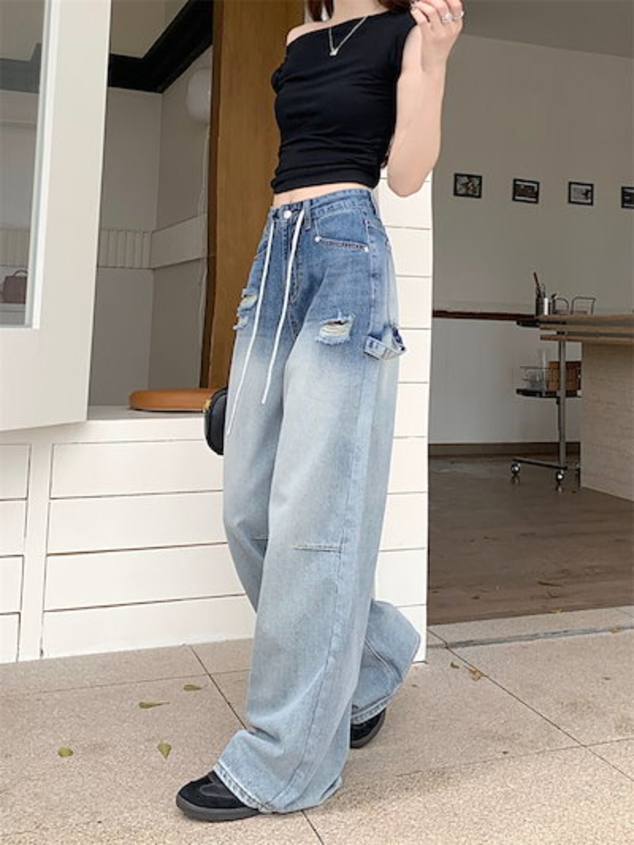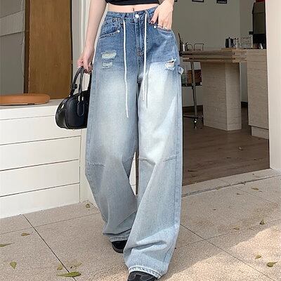 2024春夏パンツ デニム ジーンズ グラデーション ワイド ストレート ハイウエスト 脚長効果 美脚効果 細見え 春 カジュアル おしゃれ かわいい 韓国ファッション レディース お出かけ | DOKO-ME
